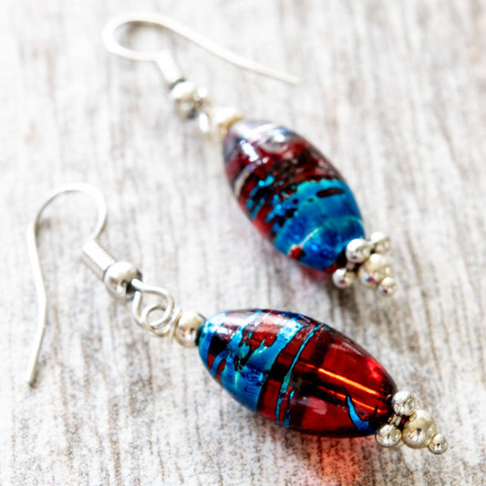 Little Treats, Fishhook Dangle Earrings with Ruby, Gold, Blue, and Silver Swirls