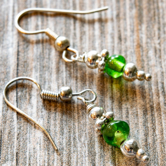 Fringe, Small Dangle Earrings with Emerald Green glass, and Silver Beads