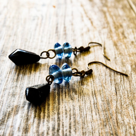 Fringe, Aged Brass Dangle Earrings with Handmade Light Blue and Jet Black Glass Beads