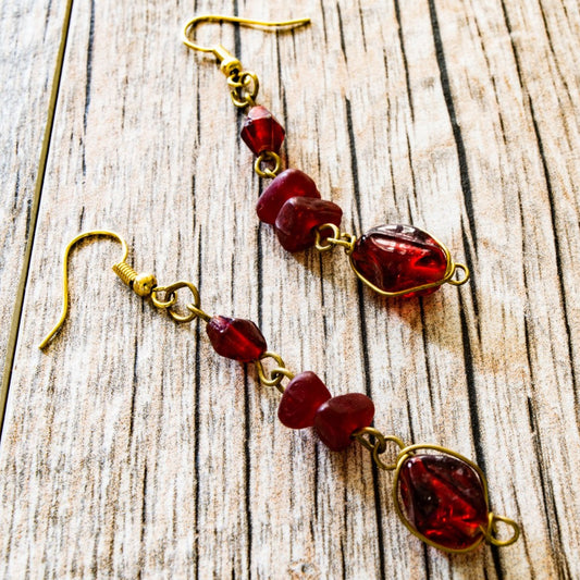 Fringe, Brass Dangle Earrings with Handmade Ruby Red Glass Beads