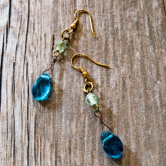 Fringe, Brass Dangle Earrings with Aquamarine Blue Glass Beads