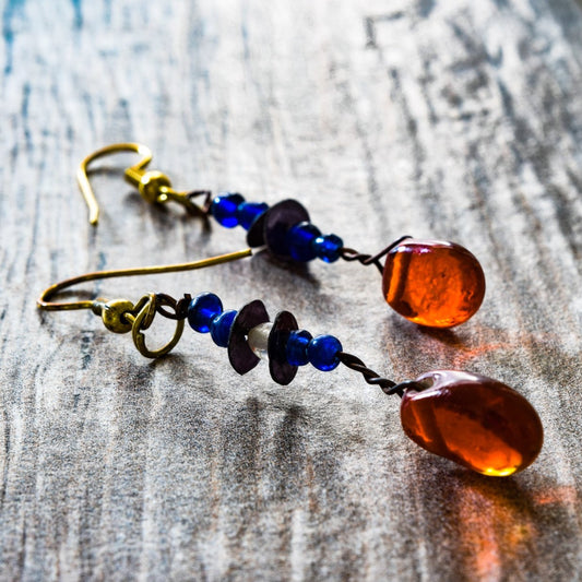 Fringe, Aged Brass Dangle Earrings with Handmade Orange and Blue Glass Beads