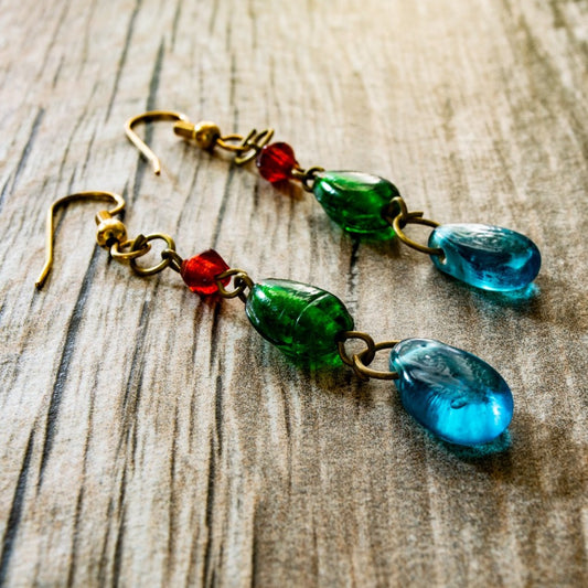 Little Treats, Dangle Earrings with Black Glass and Iridescent Blues and Metallics