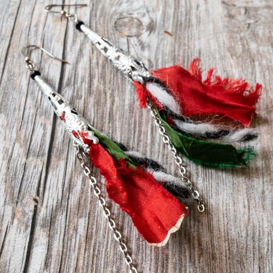 Silk Road, Sari Silk Dangle Earrings with Four Colors - Red, Emerald Green, Black, and White