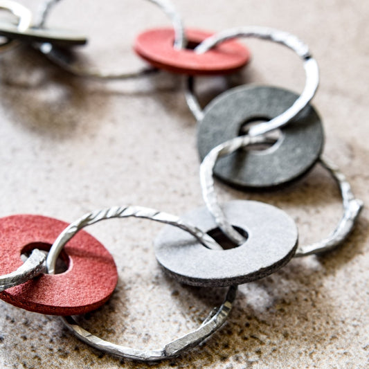 Rings, Hammered Steel Bracelet with Red and Black Fibre Washers