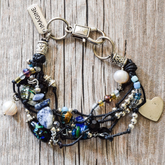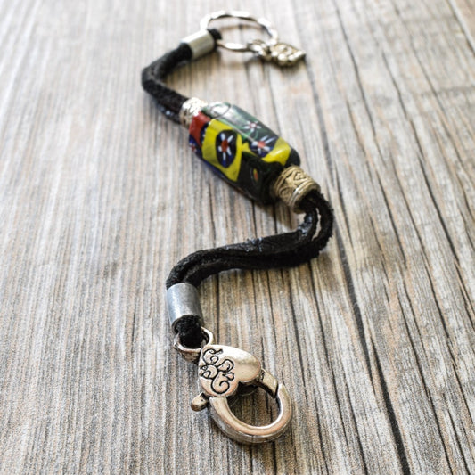 Soft Surrounds, Black Leather Bracelet with Multi-Colored Glass Bead, a Silver Heart, and a Lobster Claw Clasp
