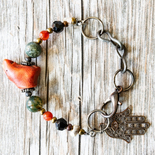 Artisan Series, Sadie Bracelet with Red Coral, Cinnamon Agate, Jasper, and a Hamsa