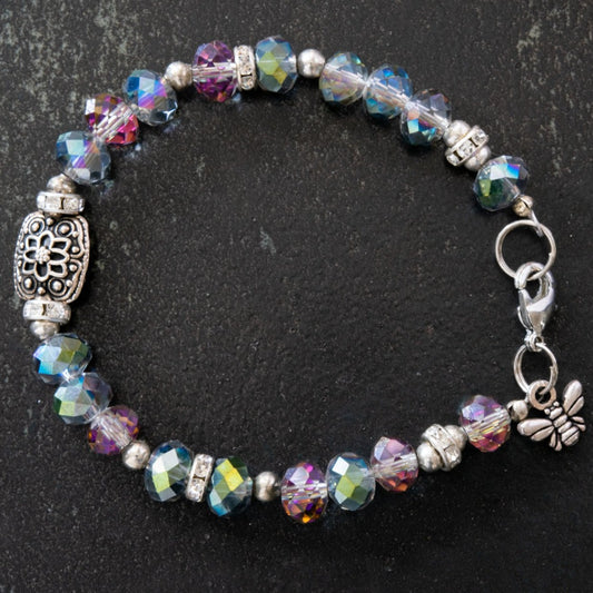 Expressions in Blue, Bracelet with Electro-Plated Crystals, Silver beads, and an Antiqued Silver Flower