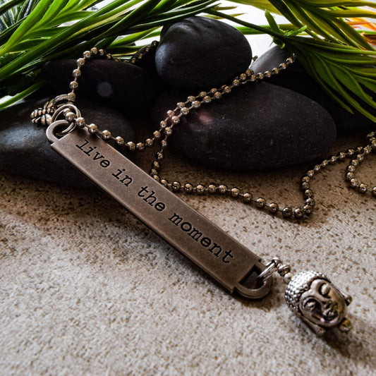 Words to Inspire, Ball Chain Necklace with Tag Engraved "Live in the Moment"