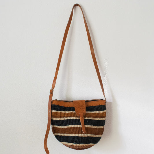 Sisal and Leather African Cross-Body Sling Bag, with Black, Brown, and Cream-Colored Stripes
