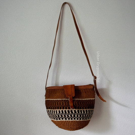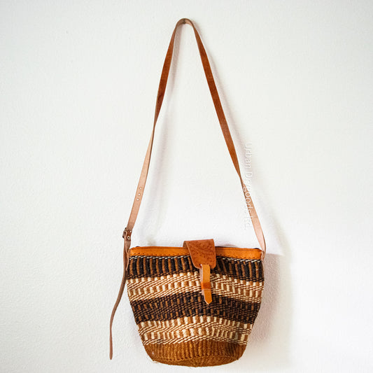 Sisal and Leather African Sling Bag, with Rust, Brown, and Cream Horizontal Stripes and Vertical Stitching