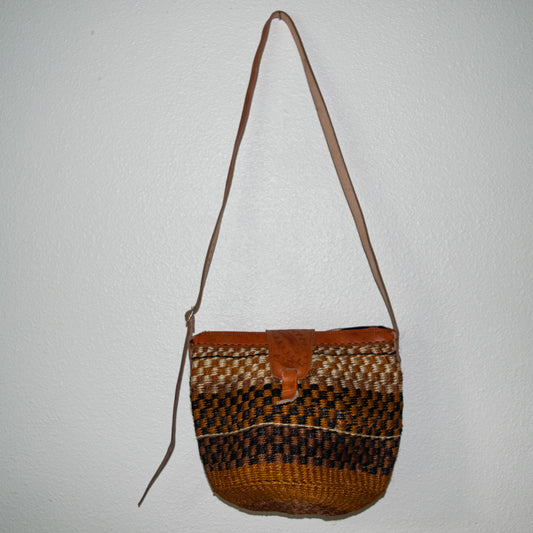 Sisal and Leather African Cross-Body Sling Bag, with Black, Brown, and Gray Checks