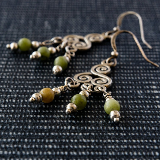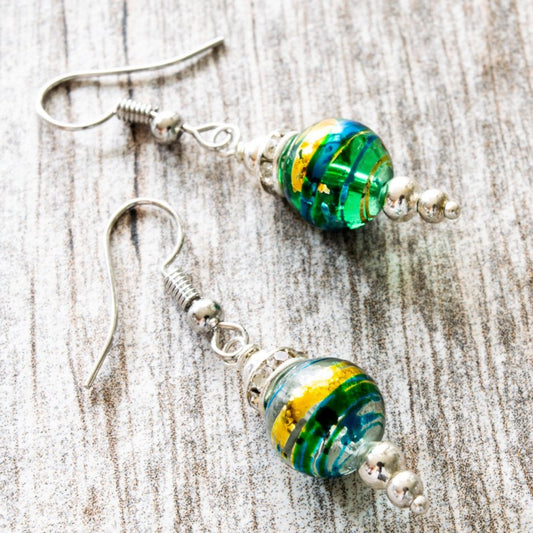 Little Treats, Fishhook Dangle Earrings with Emerald Green Glass and Silver Swirls
