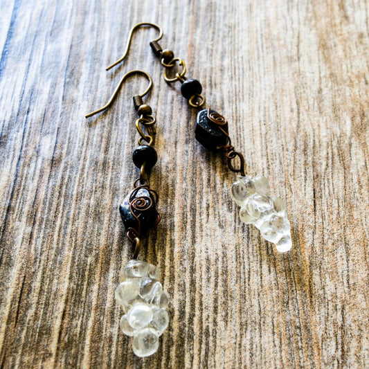 Fringe, Aged Brass Dangle Earrings with Handmade Clear and Black Glass Beads