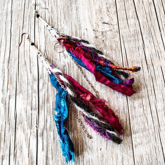 Silk Road, Sari Silk Dangle Earrings with Four Colors - Burgundy, Blue, Black, and White