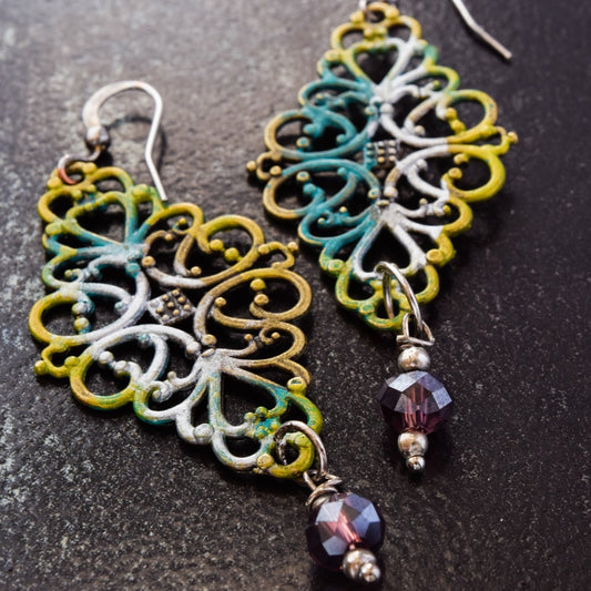 Filigree, Diamond Shaped Dangle Earrings with Lavender Crystal