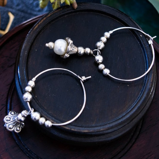 Hoop Earrings With Pearl And A Silver Flower Dangle