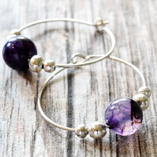 Expressions in Amethyst, Silver Hoop Earrings with Amythyst Beads