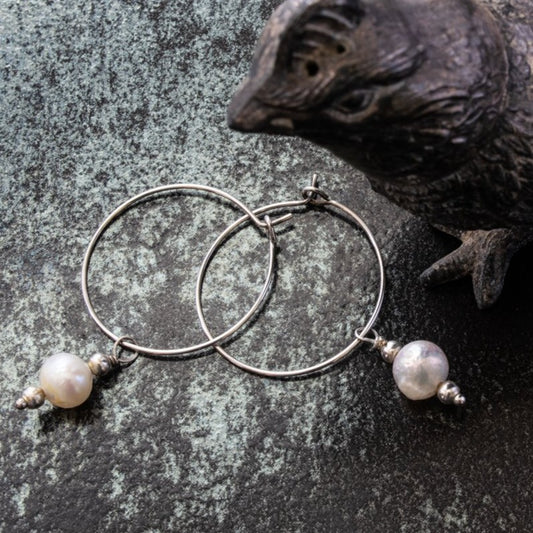 Expressions in Pearls, Silver Hoop Earrings with Fresh Water Pearl Dangle