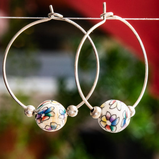 Little Treats, Flowers Silver Hoop Earrings with Little Colored Painted Flowers on White Polymer Clay