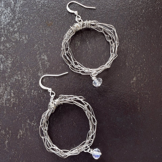 Rain Drops, Woven Wire Dangle Hoop Earrings with Clear Crystals