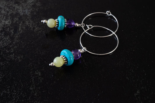 Amethyst, Tquroise & Pardot Silver Hoop Dangle Earrings