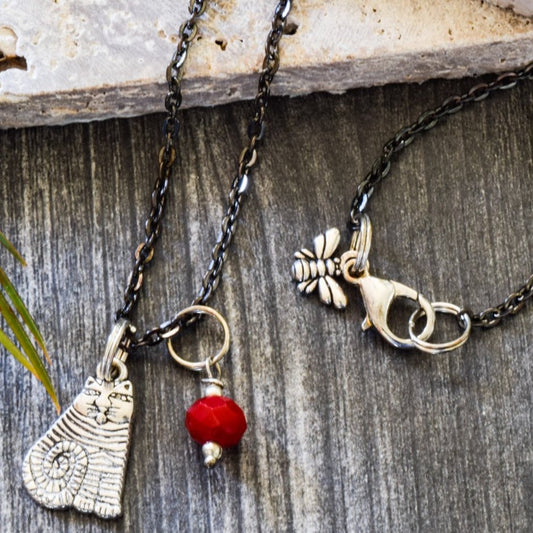 Little Treats, Fat Cat Antiqued Steel Chain Necklace with a Silver Cat Charm and Red Crystal