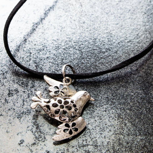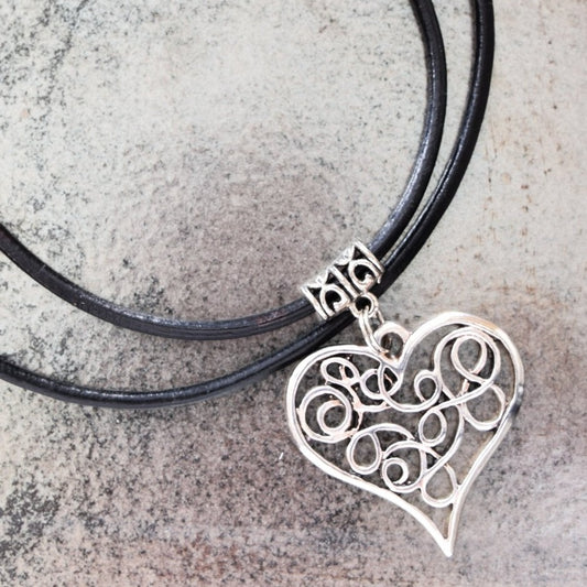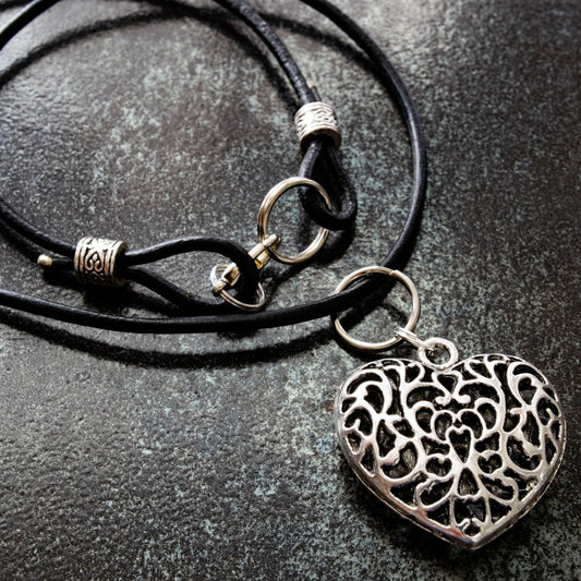 Wonderful Things, Adjustable Black Leather Necklace with a Large Silver Filigree Heart