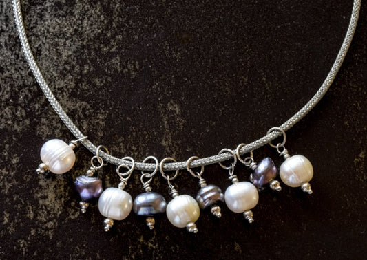 Dancing Pearls, Necklace with White and Prussian Blue Pearls