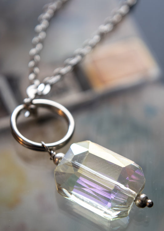 Expressions in Blue, Gunmetal Chain Necklace, with Emerald Cut Crystal Pendant