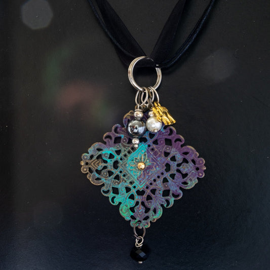 Wraps, Necklace with Shell Pendant Wrapped in Beads on Back Ribbon